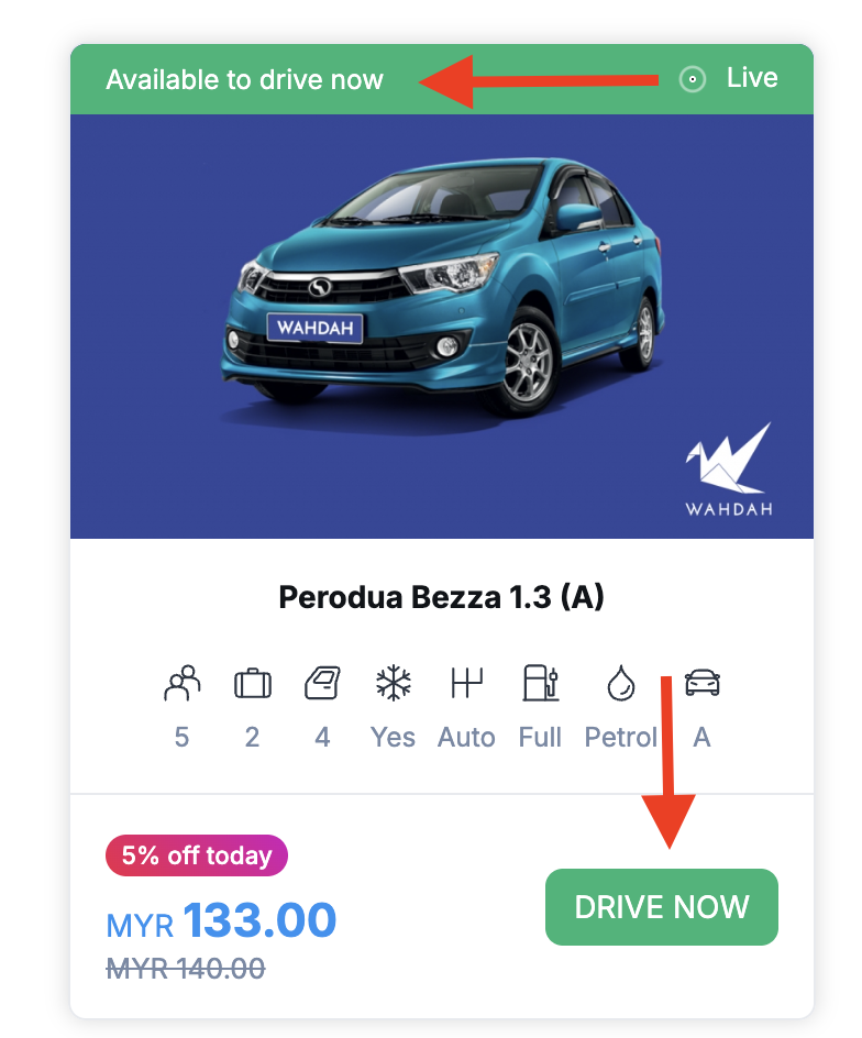 You won’t be able to make a booking for a rental starting within the next 12 hours or less on our website. The Live Car feature is designed for last-minute bookings, available for pick-up within 12 hours.