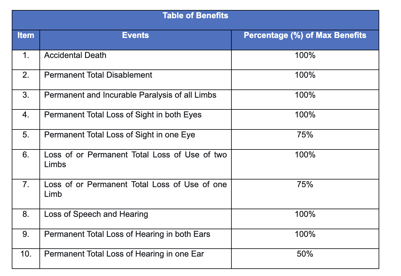 It is hereby declared and agreed that the Table of Benefit as stated in the Group Personal Accident Insurance Policy Wording is amended to read as follows and not otherwise stated:-